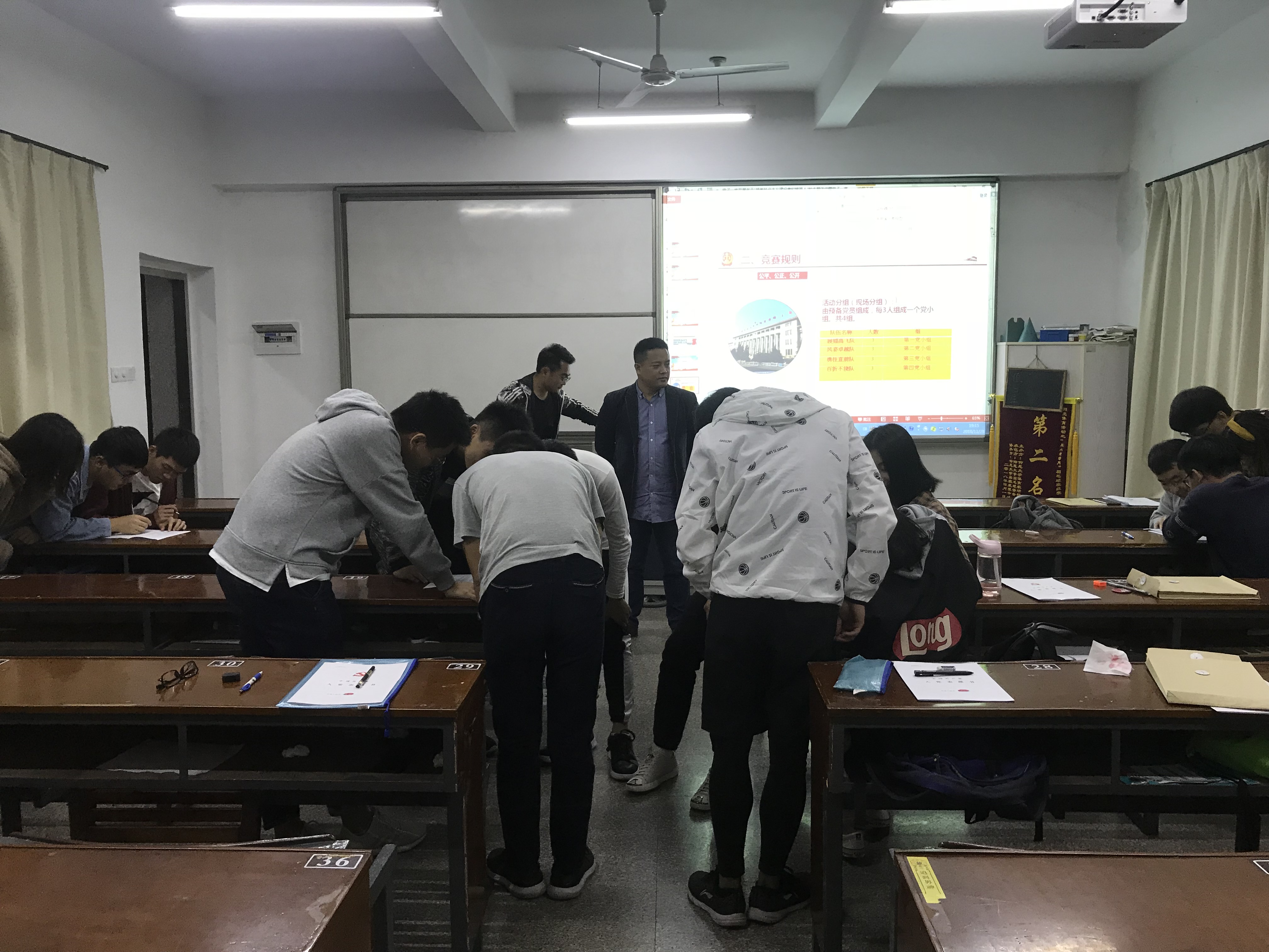此次活动分为三个环节进行。首先是回顾党史、重温入党誓词,增强参赛选手的党性观念。回顾中,本次知识竞赛拉开序幕。第二个环节是知识竞赛环节,竞赛分为三轮;有四组参赛选手,由来自电子一支的16名预备党员组成。采用闭卷填空、抢答题和压分抢答的形式,主要包含了基层组织建设、党建党史以及十九大报告等方面内容。比赛现场如火如荼,选手们认真思考,积极抢答,对题目中涉及的热点问题或者知识薄弱点,小组之间展开激烈的讨论。经过一番激烈的竞赛,由第三党小组“勇往直前队”夺取本次知识竞赛的胜利。