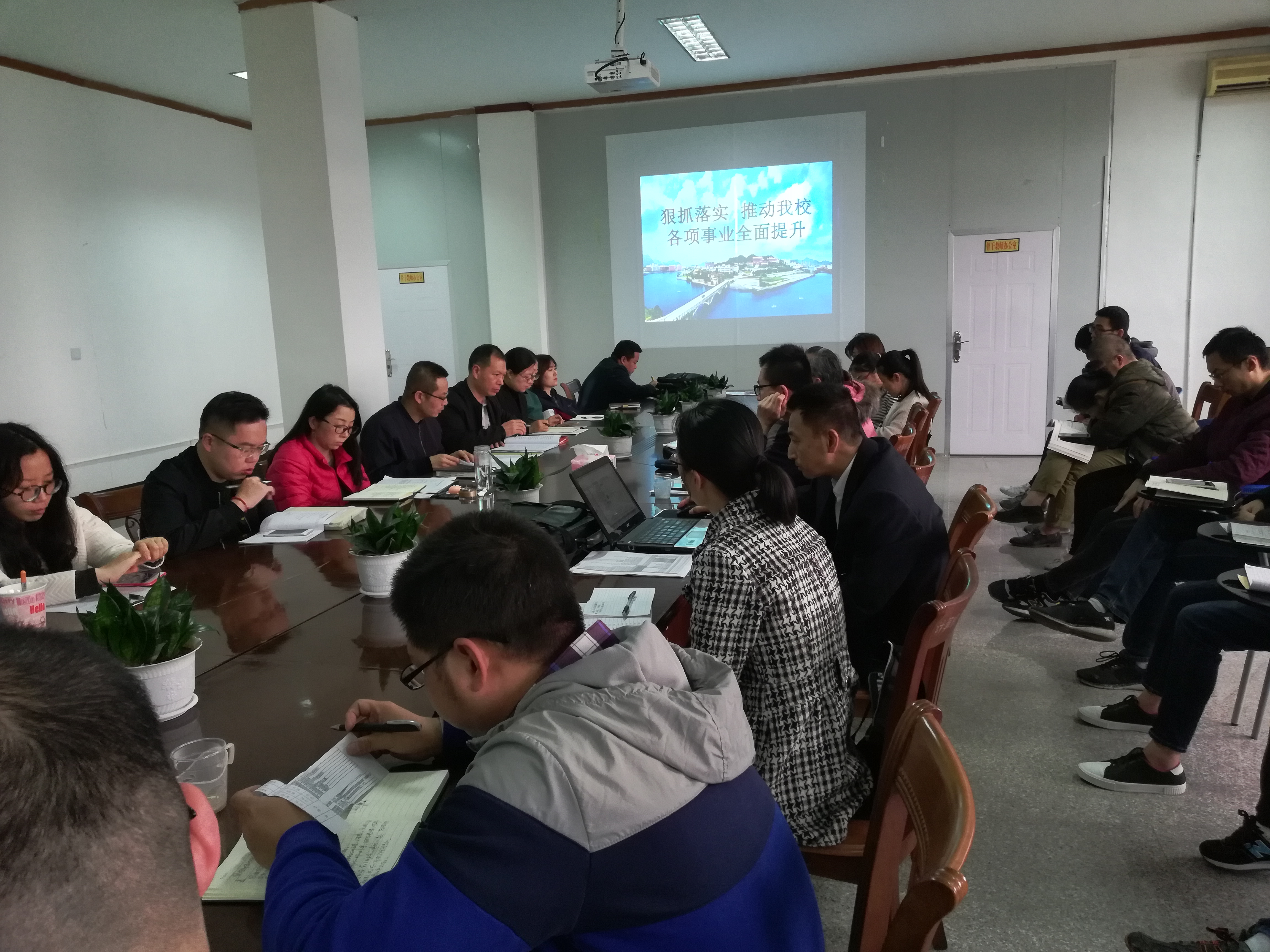 4月17日下午,yl7703永利官网组织全体教职工在泽钏楼四楼会议室学习我校一届四次教代会“狠抓落实 推动学校各项事业全面提升”的工作报告”,会议由常务副院长金承勇主持,全体教职工出席本次会议。