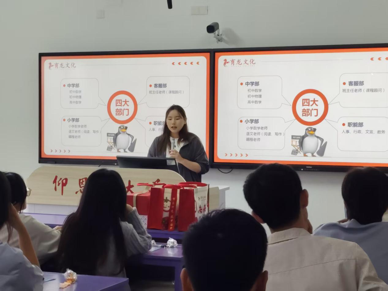随后,詹璐洁经理结合视频内容,系统介绍了育龙学校的发展概况,针对员工重点关注的岗位需求,详细解读了教学教研、课程顾问、校区管理等核心岗位的职责要求、晋升路径及薪资福利体系,并特别说明学校为新人定制的岗前培训与在职成长计划。