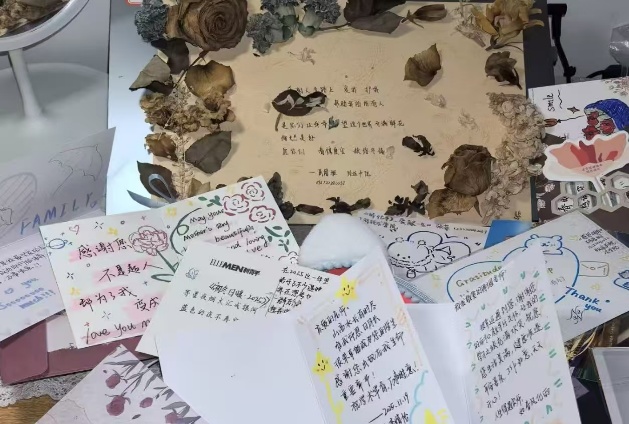 活动自宣传之日起便受到同学们的广泛关注,50个活动名额在报名启动后迅速报满。活动期间,同学们围绕感恩主题,充分发挥创意与巧思,创作出一张张别出心裁的手工贺卡。有的以干花点缀,营造复古温馨的氛围,有的绘制黑白百合插画,展现精致质感,有的呈现立体造型,弹出的花朵颇有巧思,让画面更生动。这些作品兼具手工的温度与艺术的美感,将感恩之情凝聚于方寸之间。经评选,陆薪羽、卢钰、王依婧等五位优秀创作者的作品脱颖而出。